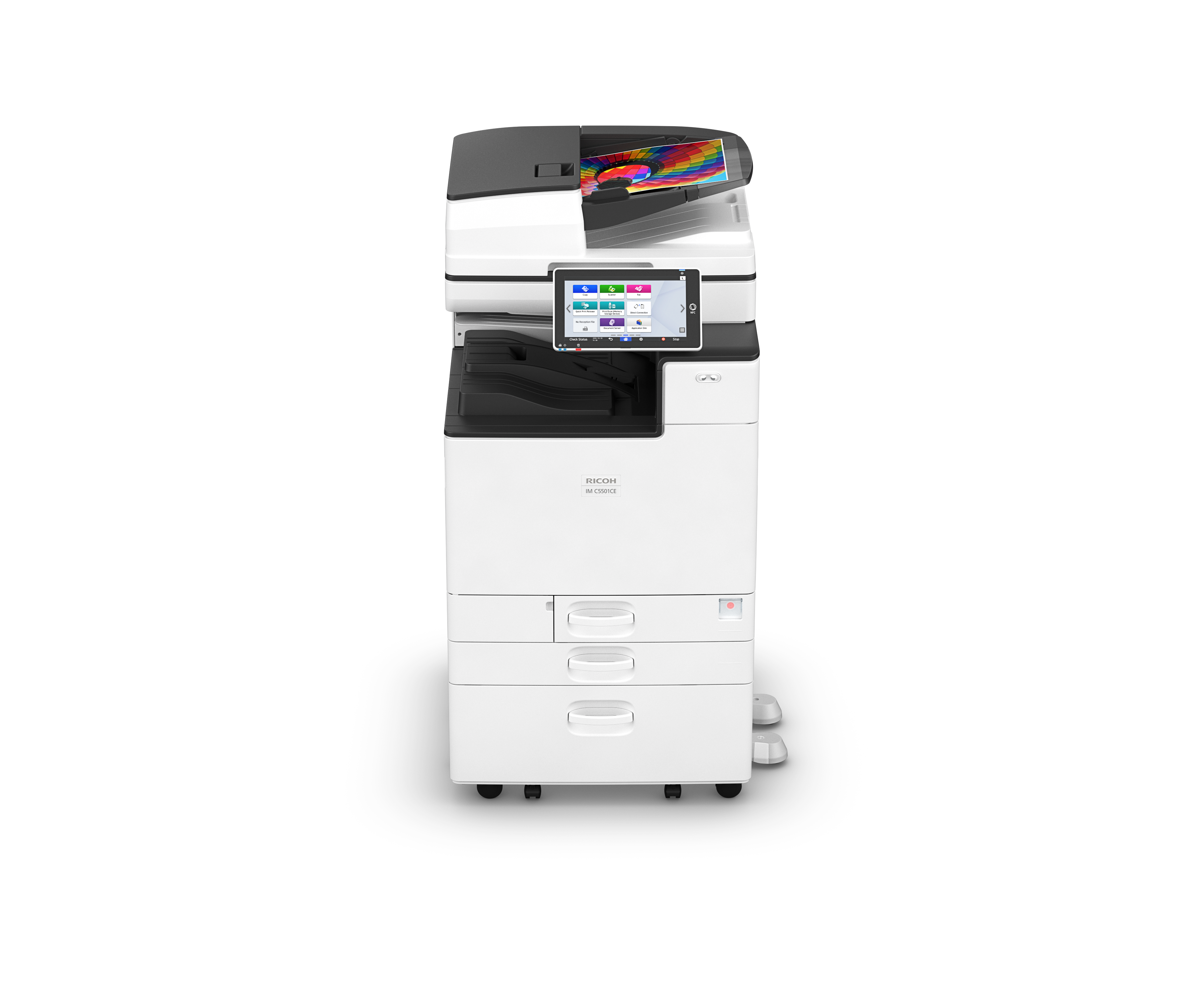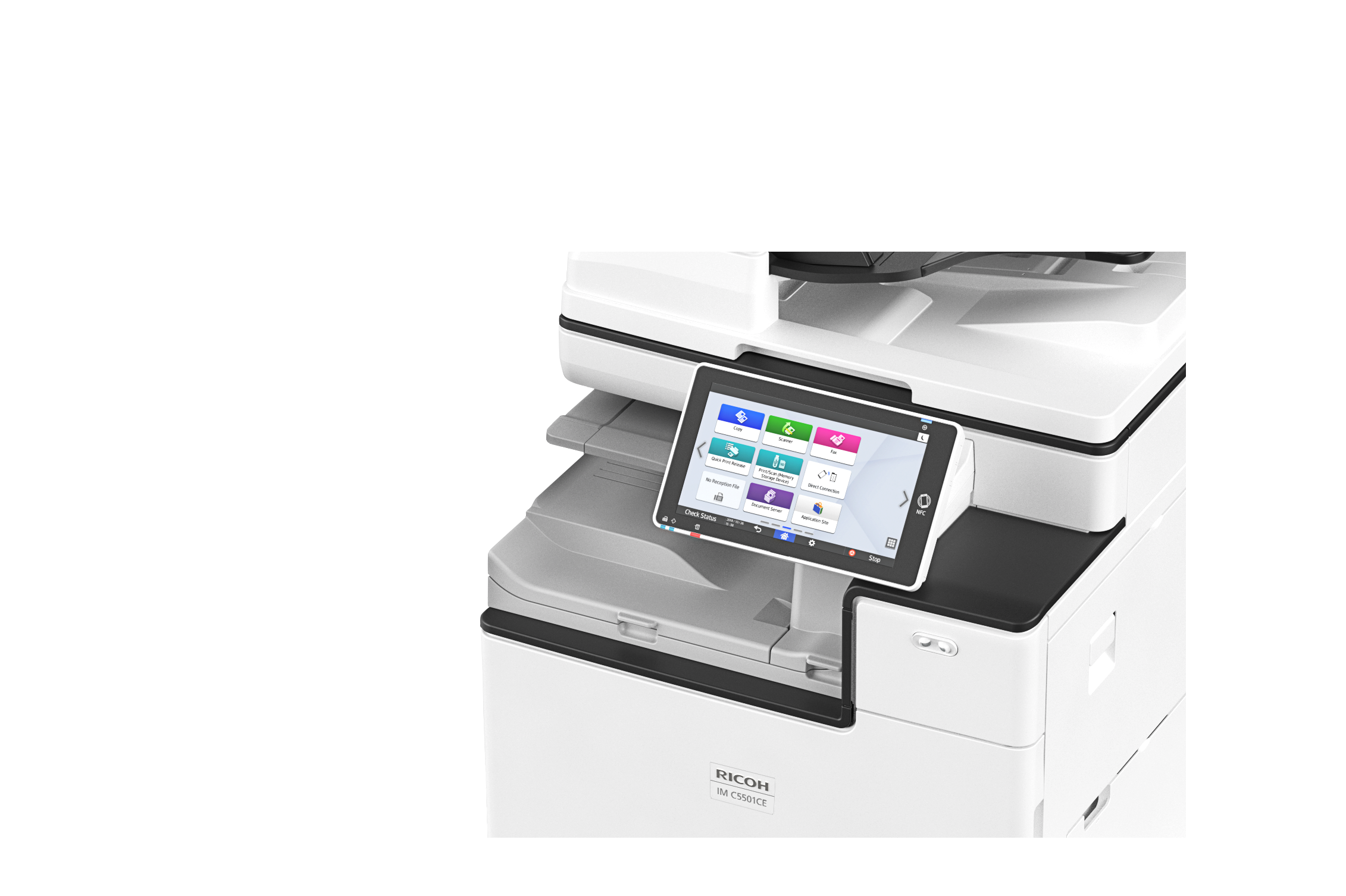 Urządzenie IM C5501CE zostało zaprojektowane z myślą o zwiększeniu wydajności w miejscu pracy przy jednoczesnym zachowaniu elastyczności i różnych potrzebach biznesowych. Inteligentny dotykowy panel sterowania zapewnia intuicyjny dostęp do łatwych w użyciu funkcji, które umożliwiają użytkownikom szybkie dotarcie do odpowiednich dokumentów, tworzenie niestandardowych skrótów i integrację z aplikacjami w chmurze w celu sprawnego zarządzania plikami.